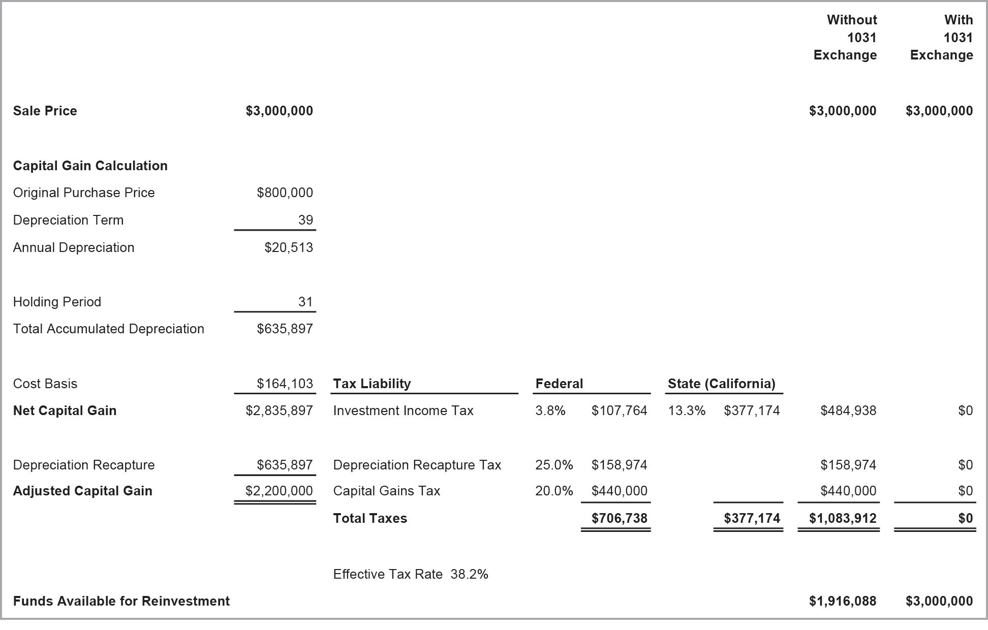 For instance, if an investor in California purchased a property in 1995 for $800,000 and sells it today for $3 million, the net capital gain would be $2.8 million. Without a 1031 exchange, the investor could face significant taxes on this gain. By using a 1031 exchange and reinvesting in like-kind property, the investor can defer the capital gains taxes that would otherwise be due upon sale, preserving more capital for reinvestment.